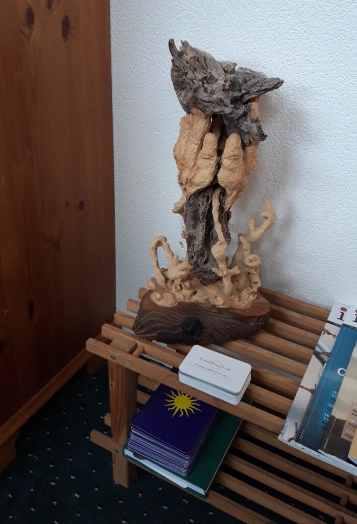Die dag ging ik naar mijn praktijk en ik zette de stok om de ramen mee te sluiten en openen tegen de muur. De stok viel ineens naar beneden en raakte mijn moeders kunstwerk die daar vlakbij op een rekje stond. Zie foto.